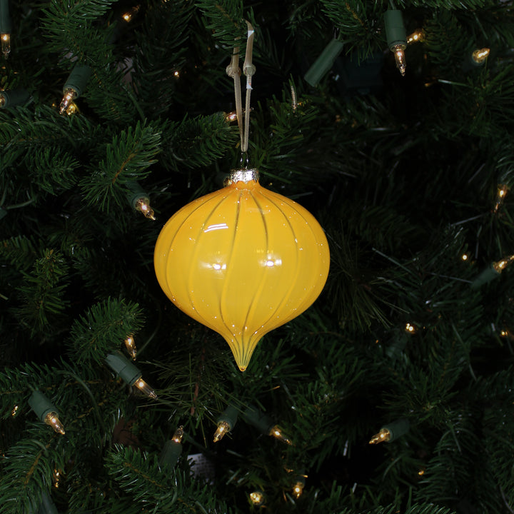 Boule en verre fleuron moutarde 4" avec une forme élancée qui accentue la sophistication. Sa couleur moutarde chaleureuse se distingue dans un décor classique ou moderne. Les reflets subtils illuminent le sapin avec élégance. Idéale pour rompre la monotonie des formes rondes.