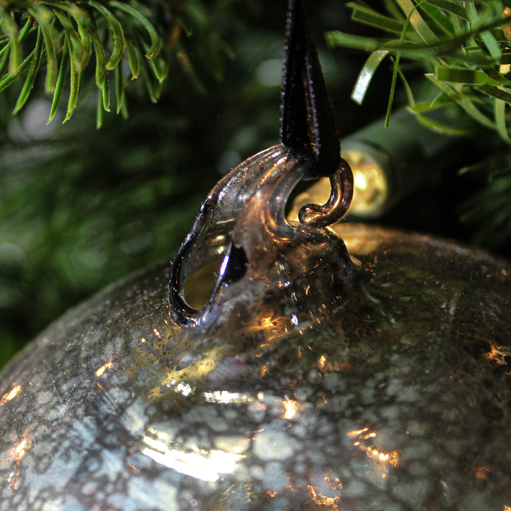 La boule en verre mercure noir accentue le côté luxueux grâce à son format légèrement plus grand. Sa surface patinée reflète les lumières de façon tamisée pour une ambiance feutrée. Elle s’intègre parfaitement dans une palette monochrome ou métallique. Élégante et intemporelle, elle apporte une touche de mystère au sapin. Une valeur sûre pour un style haut de gamme.