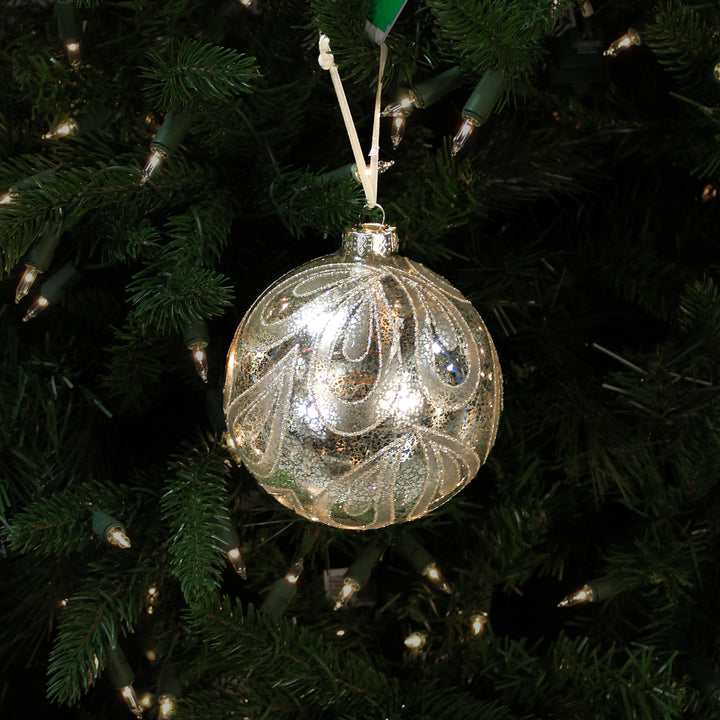 Boule en verre mercure tourbillonnante argent patiné 4,5" au charme intemporel, ornée d’un délicat motif en spirale qui capte la lumière à chaque mouvement. Sa finition argent patiné apporte une touche vintage sophistiquée, parfaite pour un thème élégant et classique. Elle se marie harmonieusement avec des décorations argentées ou blanches. Idéale pour créer un point focal raffiné dans le sapin.