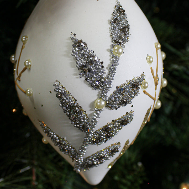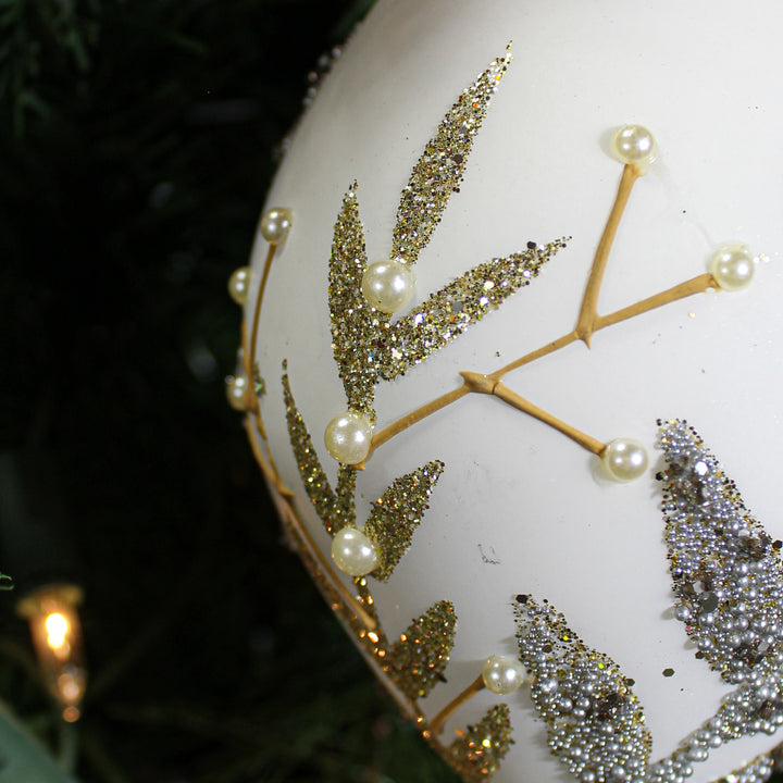 Boule en verre oignon feuilles paillettes platine blanc mat 4"