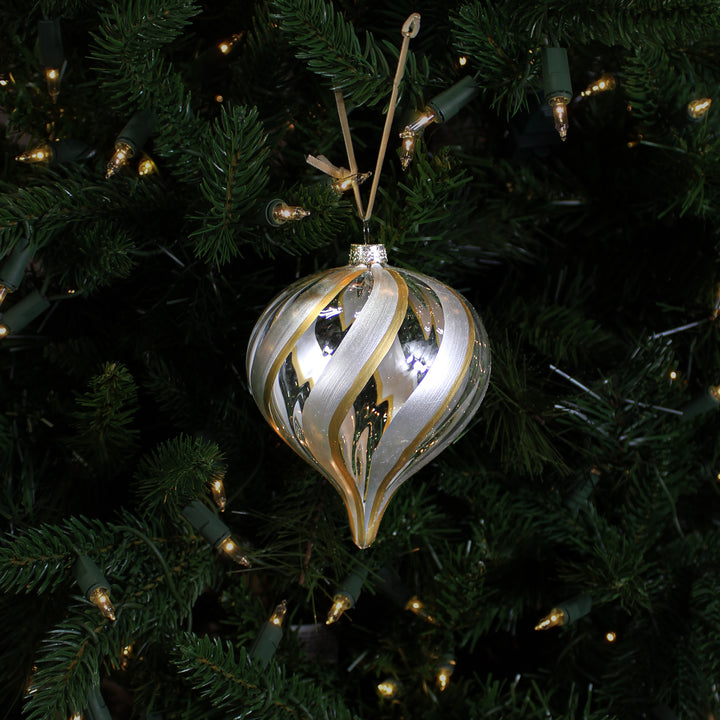 Boule en verre oignon tourbillon de paillettes argent transparent 4" qui combine la grâce d’une forme élancée et l’éclat argenté. Les paillettes ajoutent une dimension festive tout en restant raffinées. Se marie parfaitement avec des tons bleus, blancs et argentés. Idéale pour un décor glacé ou givré.