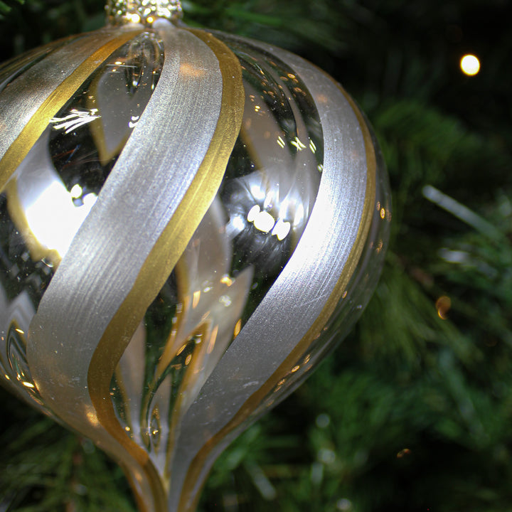 Boule en verre oignon tourbillon de paillettes argent transparent 4"