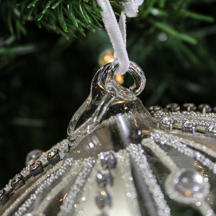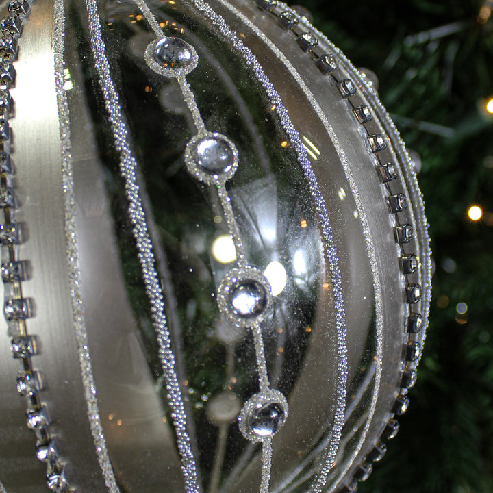 L’éclat du platine se mêle à des rayures fines et transparentes, donnant à cette boule une allure sophistiquée. Les reflets changeants enrichissent la palette lumineuse de votre décor. Parfaite pour accompagner d’autres ornements de luxe, elle apporte une touche haut de gamme à votre ambiance. Son format généreux permet de la placer en point focal sur le sapin.