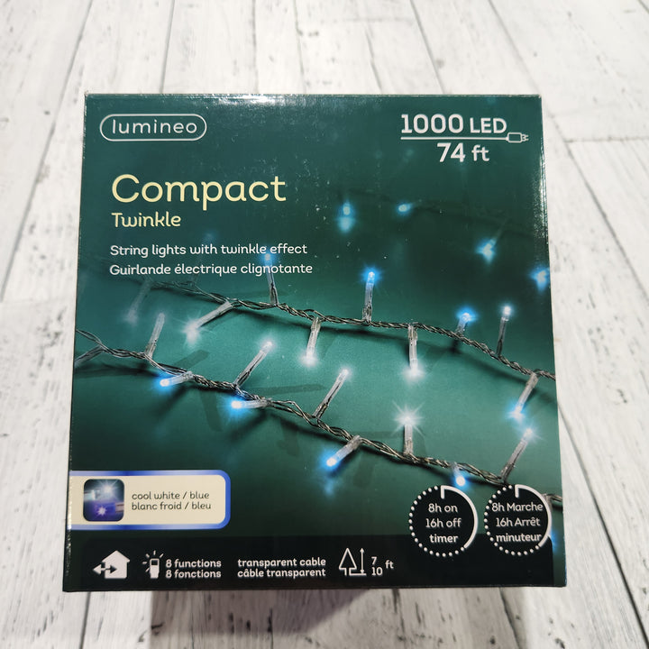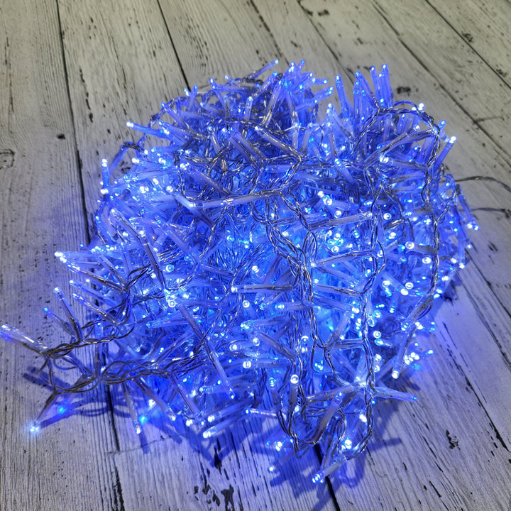 1000 Blue & White LED Lights, Transparent Wire, 8 Functions, 74'