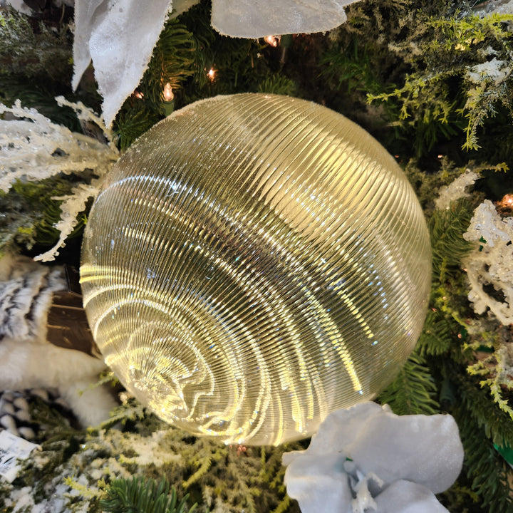 Add a magical touch to your Christmas decorations with this 10" Borealis LED ball. Its unique design and white LED lighting create an enchanting light effect, perfect for enhancing your tree, garlands or any other festive decoration. Thanks to its striking lines, it captures the light and diffuses a warm and vibrant atmosphere.