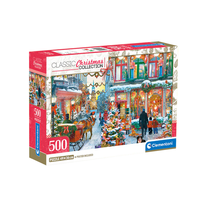The Clementoni 500-piece Christmas Joys puzzle depicts a bustling shopping street overflowing with decorations, Christmas trees, and festive lights. Horse-drawn carriages, smiling passersby, and illuminated shop windows create a warm and lively atmosphere. This colorful Christmas puzzle captures the spirit of preparations and the joy shared during the festive season. Perfect for lovers of urban and magical scenes, it offers a comforting and joyful activity. An invitation to fully savor the traditions and simple pleasures of Christmas.