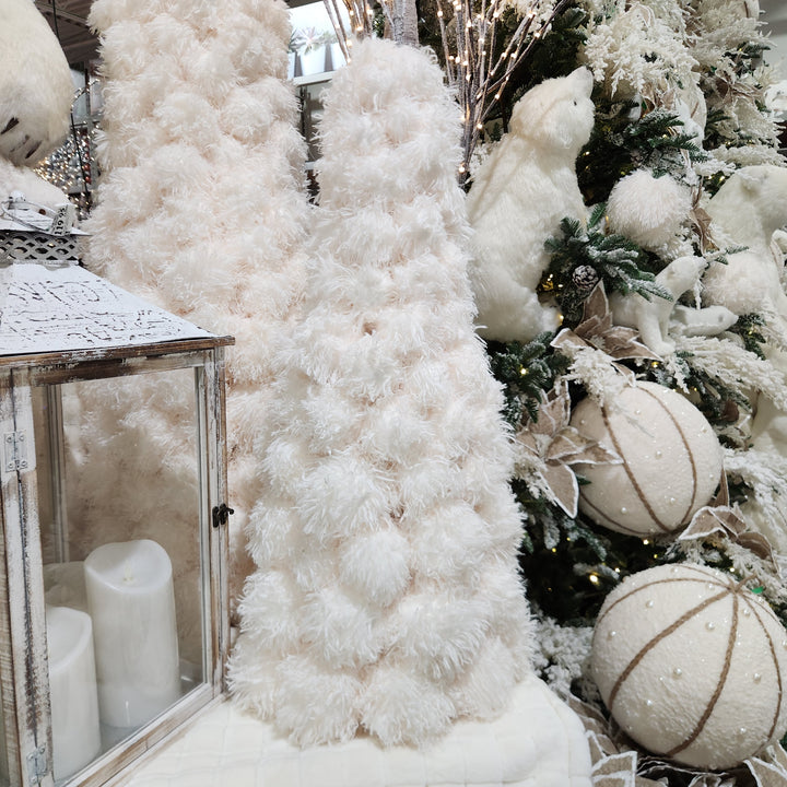 32" White Fur Ball Topiary Cone for Soft, Winter Elegance