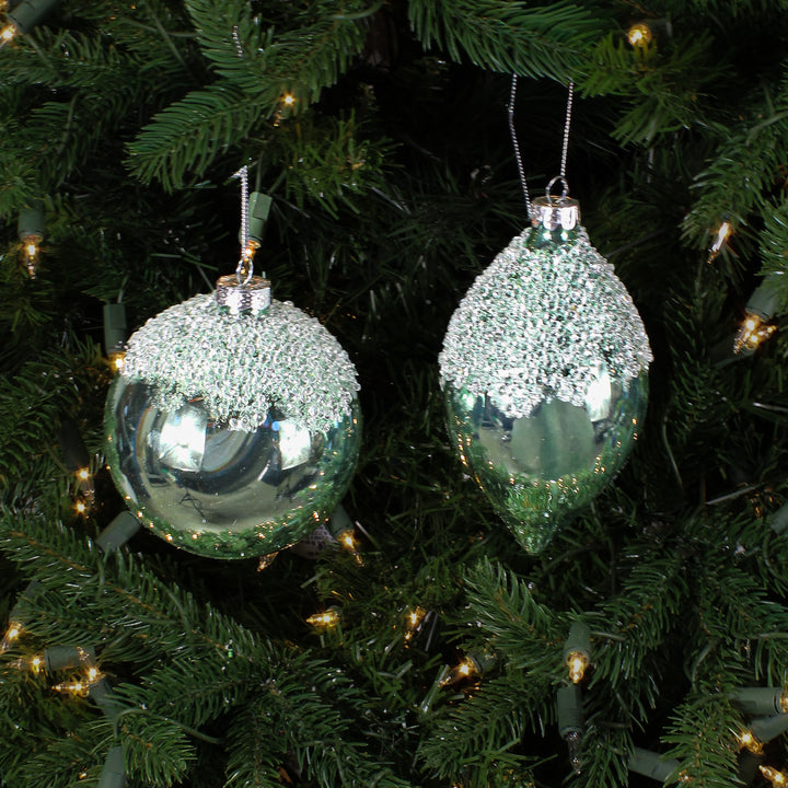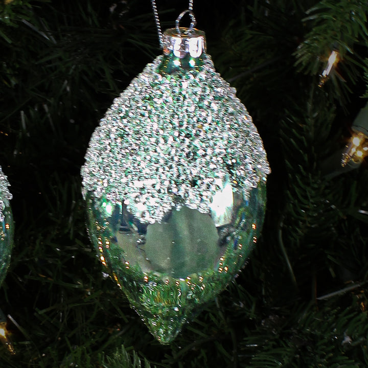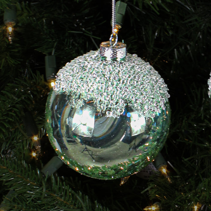 This 4" turquoise glass hanging ball ornament with matching jewel stands out with its vibrant color and refined style. The jewel embedded in the center subtly sparkles, adding a luxurious touch to this ornament. Its turquoise hue is reminiscent of icy landscapes and polar atmospheres. Perfect for adding a colorful and vibrant accent to a contemporary Christmas decor.
