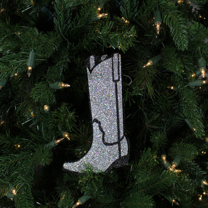 This 8" black silver glitter boot ornament offers a modern and shiny style. Its compact size makes it versatile. The silver glitter gives it a sparkle and elegance. Perfect for a themed tree or a unique decor.