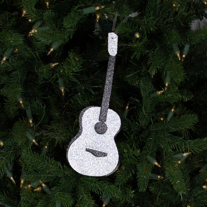 This 12" black and silver glitter guitar ornament is eye-catching with its unique and festive style. Its silver glitter contrasts elegantly with the deep black. It's perfect for a music or rock theme. A bold choice for personalizing a decor.