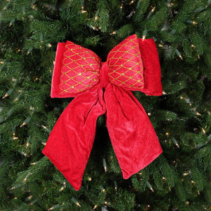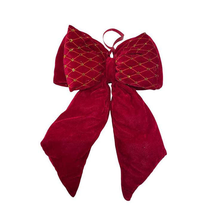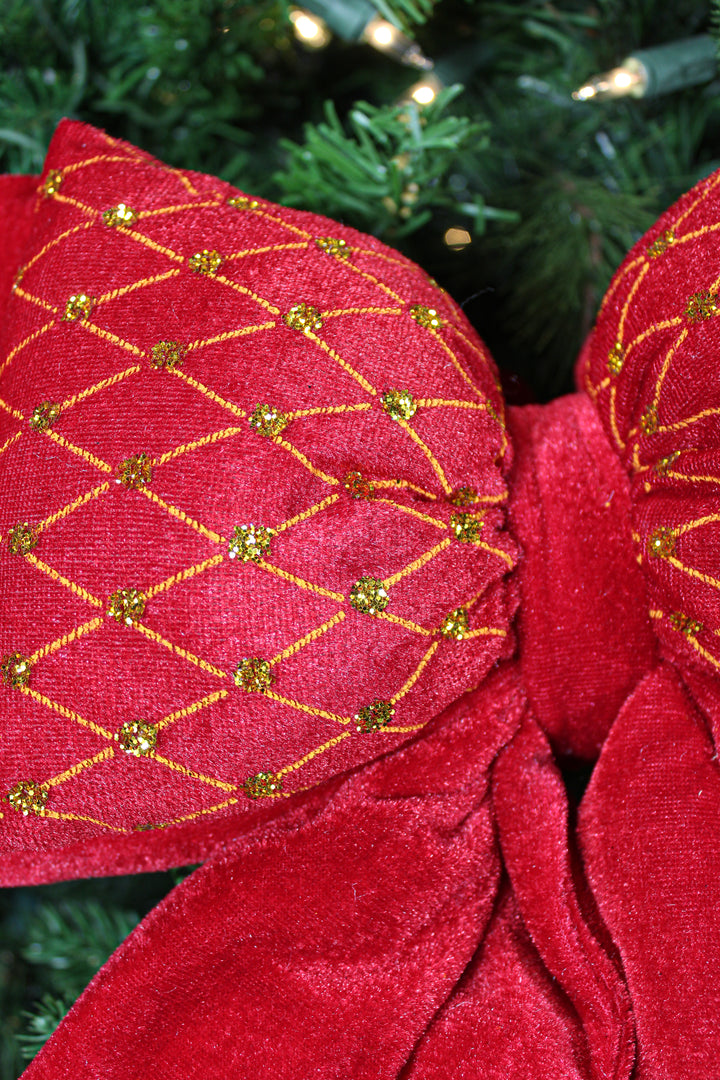 This 12" red gold sequined velvet bow ornament combines the warmth of red with the festive sparkle of gold. Its sequins sparkle under the light and draw the eye, adding vibrancy and joy. It lends itself equally well to traditional decor or a bold display. A perfect choice for brightening up trees, wreaths, or centerpieces.