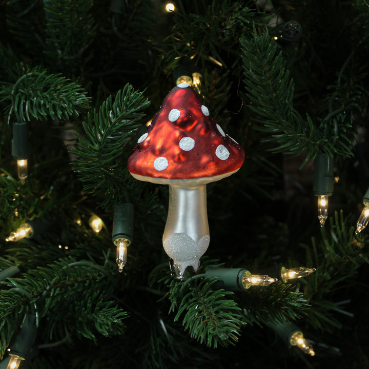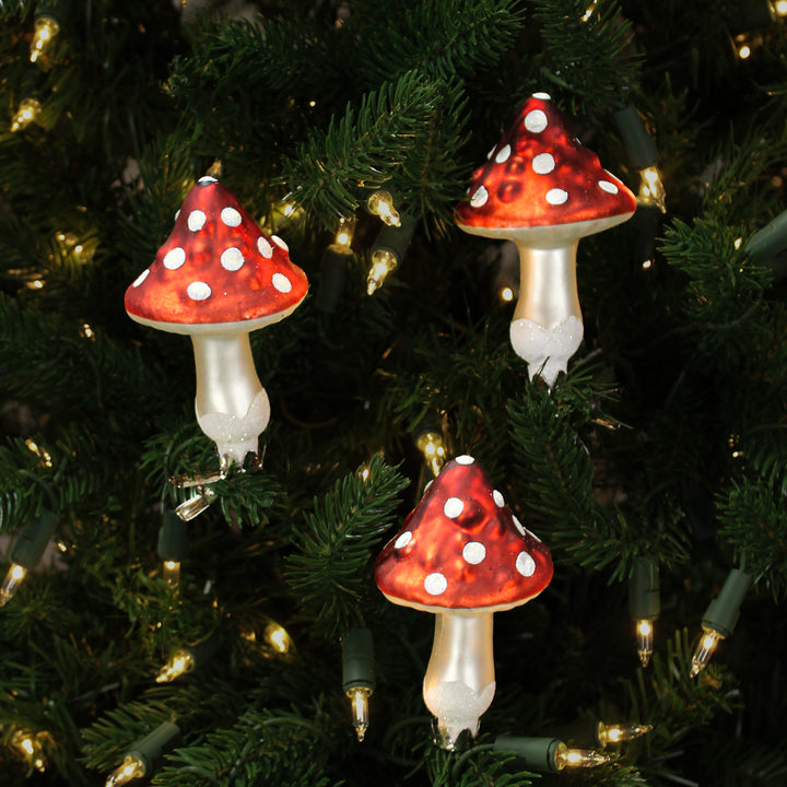 Add a magical, retro touch to your Christmas decor with this box of 3 red and white polka dot mushroom ornaments. Crafted from delicate glass, these ornaments bring a vintage, natural touch to your tree while evoking the magic of enchanted forests.