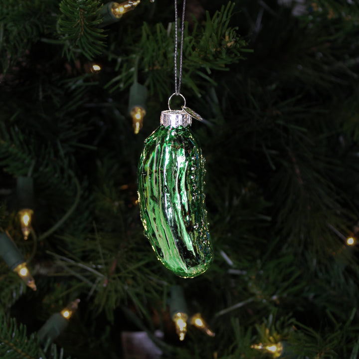 Bring a touch of humor and tradition to your tree with this green gherkin ornament made of blown glass. Inspired by a German Christmas legend, it is said to bring good luck to whoever finds it hidden in the tree on the morning of December 25th. Its glossy finish and realistic details make it a playful yet elegant decoration, perfect for surprising your guests. Suspended among classic Christmas baubles, it catches the eye and arouses curiosity. This original ornament is ideal for enriching your collection of unique and personality-filled Christmas decorations.