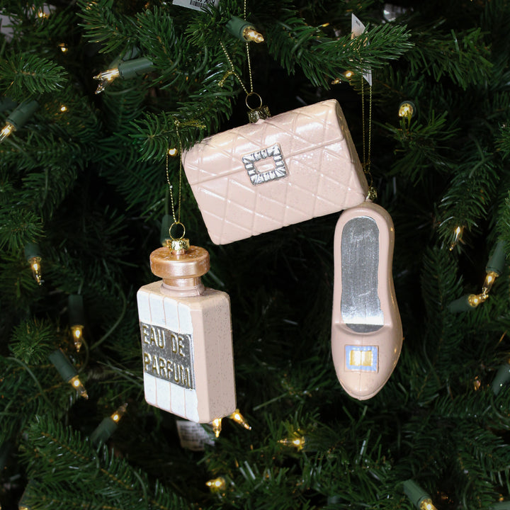 Opt for a soft and elegant ambiance with these glamorous assorted beige ornaments, available in perfume, bag, and pump styles. Each glass piece is distinguished by its feminine lines and powdery hues that bring refinement and lightness to your decor. These ornaments blend perfectly into a romantic and luminous Christmas world. They pair perfectly with gold, pink, or pearly tones for a subtle harmony. A chic and delicate touch for a refined tree style.