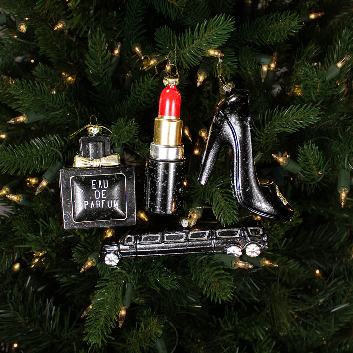 Add a sophisticated touch to your tree with these glamorous black assorted ornaments, available in limousine, perfume, pump, and lipstick designs. Their refined design and glossy finish evoke the world of luxury and beauty. Perfect for a chic and modern Christmas decoration, they bring elegance and boldness to your festive atmosphere. These unique pieces capture the light and enhance your tree with originality. Ideal for a resolutely fashionable and glamorous Christmas.
