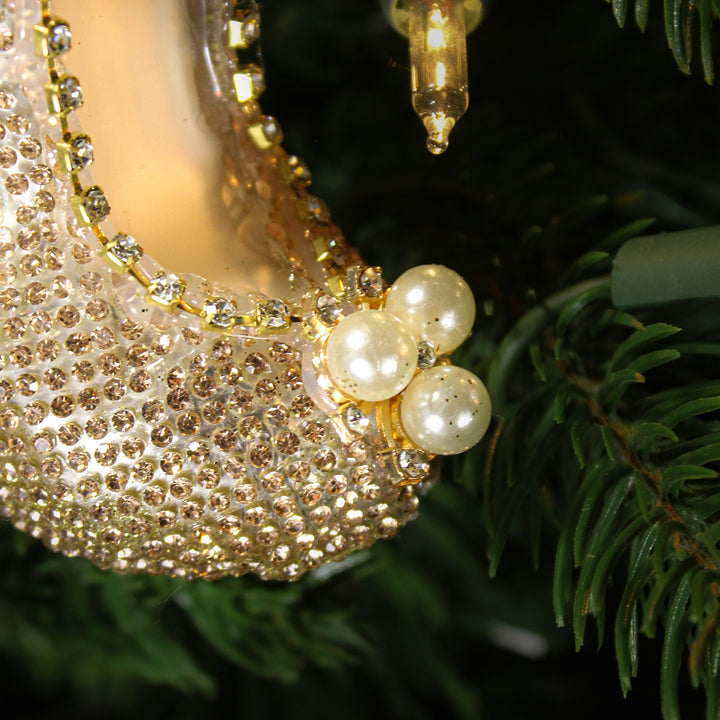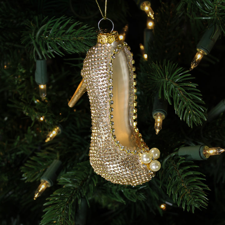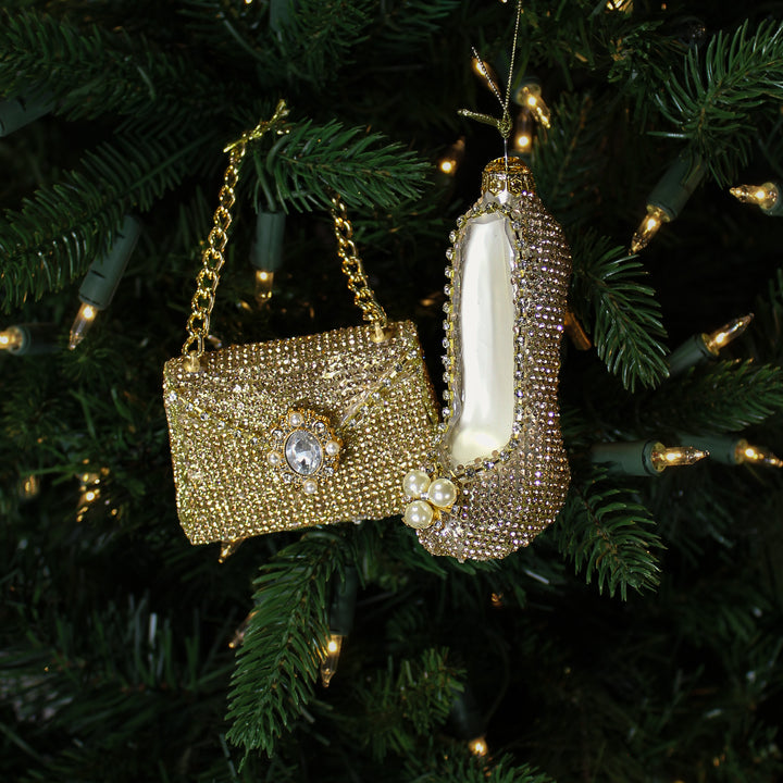 Bring a touch of fashion and sophistication to your tree with these gold glass ornaments depicting a handbag or a pump. Each piece elegantly captures the light thanks to its glossy finishes and stylish details. These glamorous decorations are ideal for creating a haute couture and feminine Christmas atmosphere. Perfect for a chic or fashionable theme, they pair harmoniously with gold baubles or satin ribbons. An original and trendy choice to enhance your festive decor.