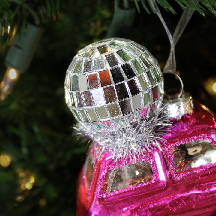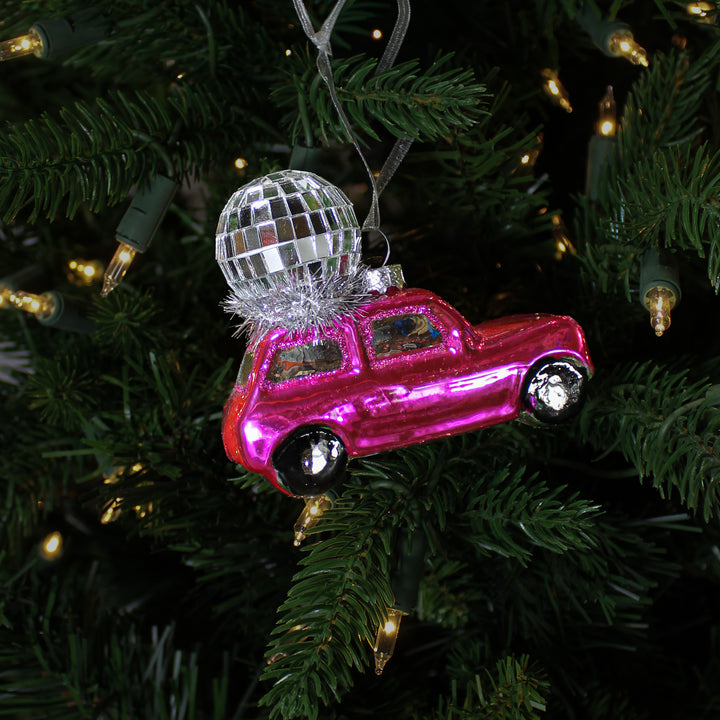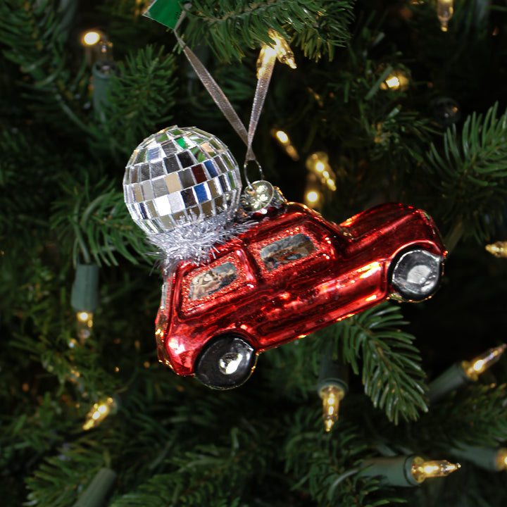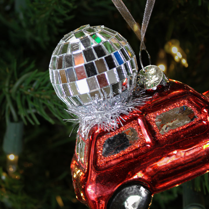 Bring a retro and festive atmosphere to your tree with this voice ornament with matching glass disco ball. This decoration full of personality combines the spirit of the disco years with a touch of automotive whimsy. The colored glass and sparkling details create a surprising and joyful visual effect. Perfect for a quirky and energetic Christmas, it immediately catches the eye. A unique piece for a colorful holiday decoration.