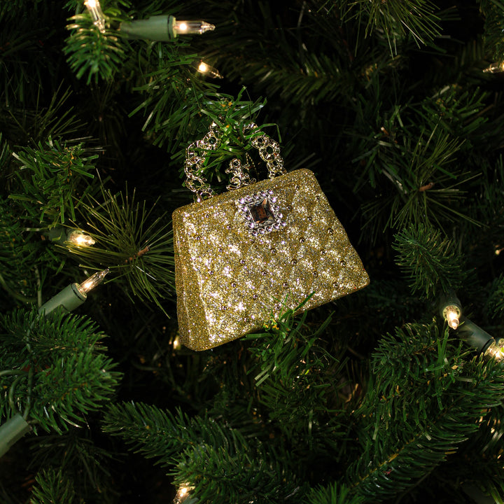 The 4" plastic glitter handbag ornament adds a glamorous and original touch to your decorations. Its glitter catches the light for a dazzling festive effect. Perfect for a chic and bold tree. A whimsical detail.