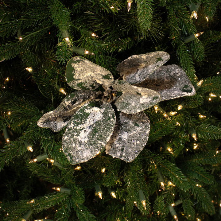 The 20" Glittering Snow Magnolia Stem features large leaves and delicately snow-covered flowers, adding a touch of freshness and elegance to your arrangements. Perfect for a chic winter setting. A bright floral accent.