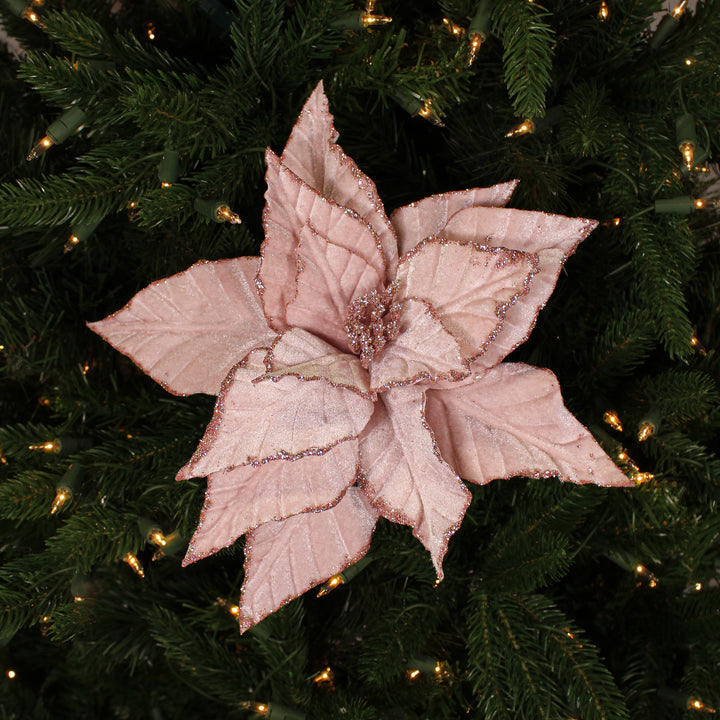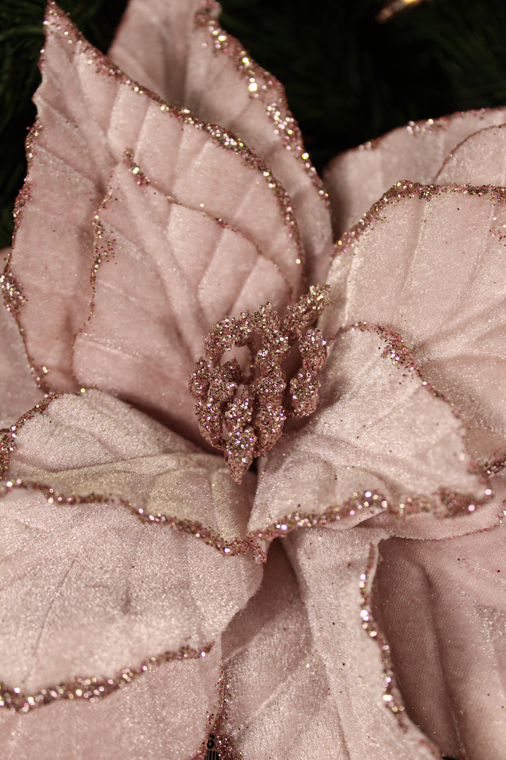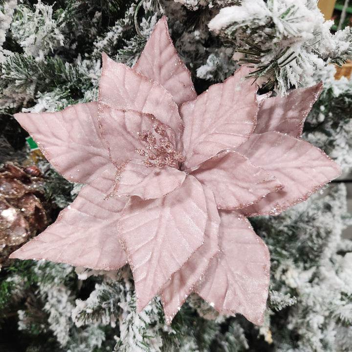 Add a touch of softness and sophistication to your holiday decorations with this 22-inch pink velvet poinsettia stem. Its soft pink textured velvet petals bring a subtle and romantic elegance to your floral arrangements, tree or centerpieces. Perfect for modern or classic decorating themes, this stem pairs perfectly with gold, silver or white tones for a bright and festive atmosphere.