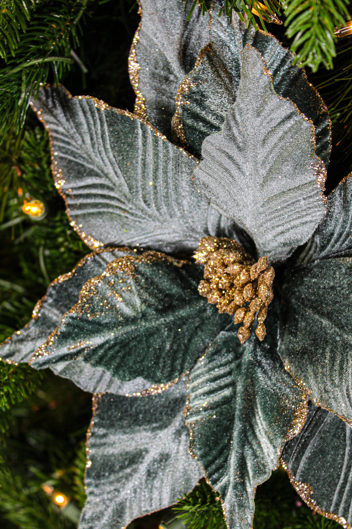 Add a touch of natural sophistication to your holiday decorations with this 22-inch moss green velvet poinsettia stem. Its soft velvet petals, in an elegant moss green, are subtly enhanced with shimmering gold details, offering a perfect blend of elegance and refinement. Ideal for enhancing your floral arrangements, decorating your tree or enriching your centerpieces, this stem blends harmoniously with gold, ivory or natural tones for a festive and soothing atmosphere.