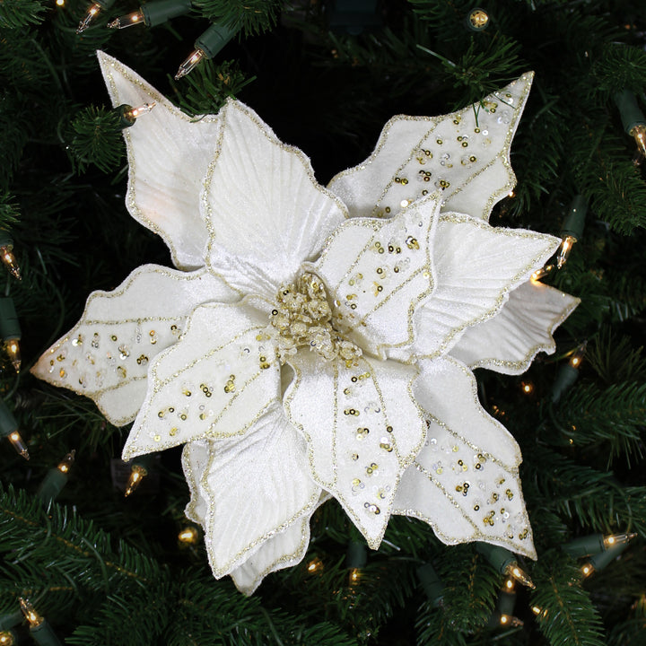 Refined and precious, this 20" cream velvet poinsettia stem with a 10" flower seduces with its soft hue and silky texture. Its delicate petals add elegance and brightness to decorations. Ideal for a tree, a wreath, or a festive table, it pairs well with gold, copper, or wood tones. It creates a chic and timeless ambiance.
