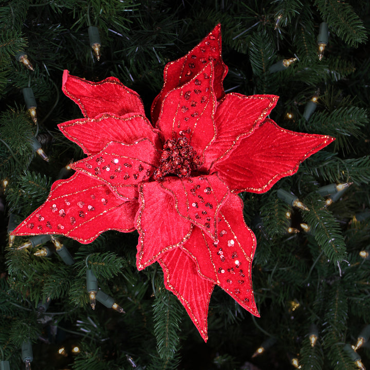 Classic and vibrant, this 20" red velvet poinsettia stem with a 10" flower embodies the warmth and tradition of the holidays. Its velvety texture and realistic petals bring authentic charm. Ideal for a tree, garland, or centerpiece, it complements shades of gold, green, and cream. It creates a warm and festive look.