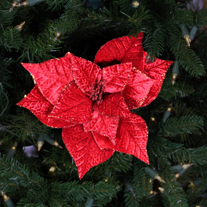 Traditional and vibrant, this 20" red velvet poinsettia stem with 12" flower embodies the warm spirit of the holidays. Its soft texture and realistic petals add authenticity and elegance. Ideal for a tree, garland, or floral arrangement, it pairs well with shades of gold, green, and cream. It brings brightness and warmth to your decor.