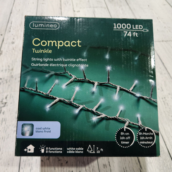 1000 lumières DEL blanc froid, fil blanc, intérieur et extérieur, 8 fonctions, 74'