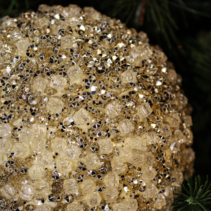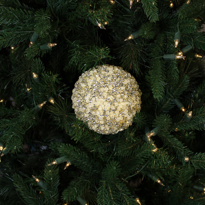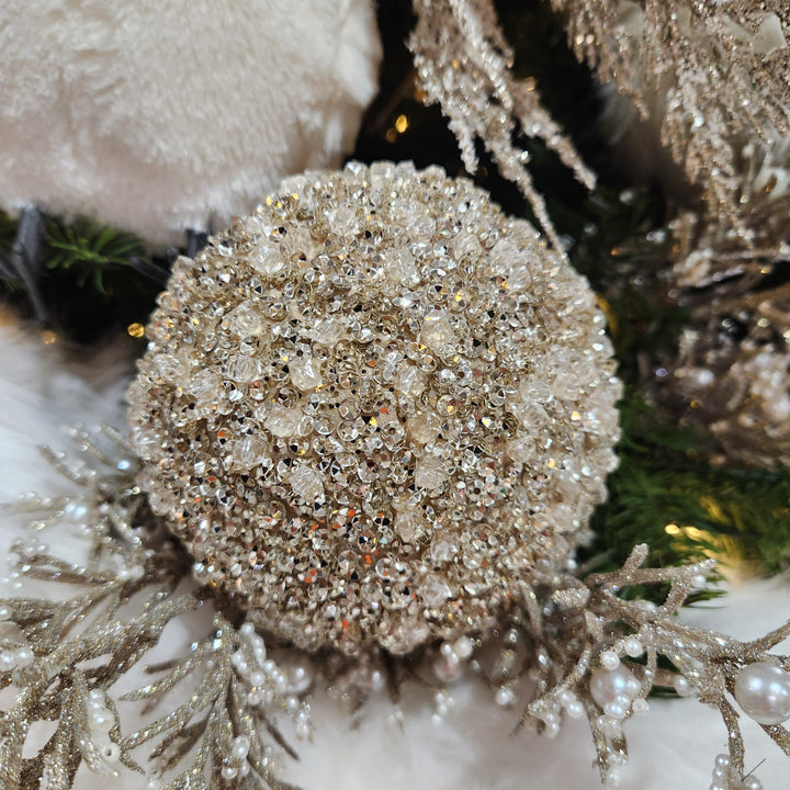Cette boule perles champagne et blanc 5" se marie parfaitement avec d'autres ornements festifs et s'intègre à différents styles de décor, ajoutant une dimension de luxe à vos créations de Noël.