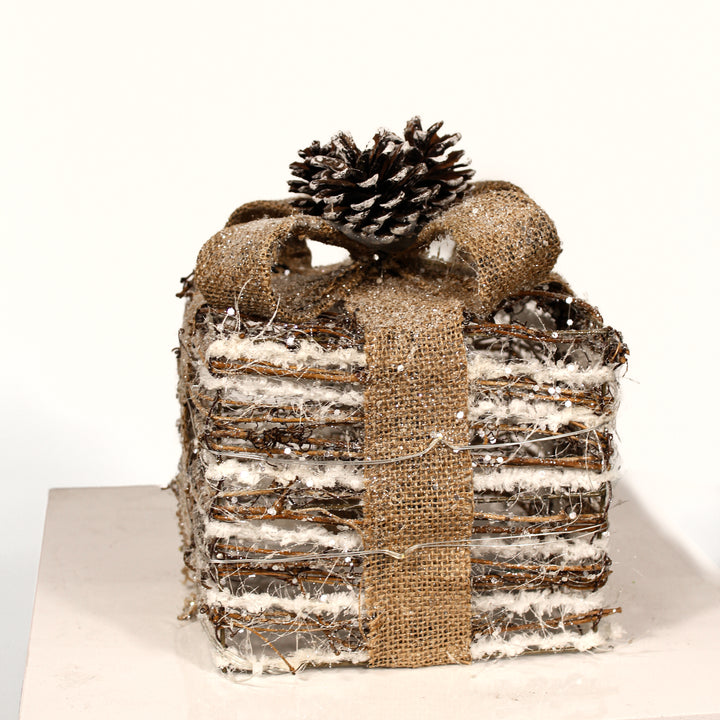 Petite et charmante, cette boîte cadeau en jute avec lumières intégrées est parfaite pour décorer une table d'entrée, une étagère ou un coin festif.