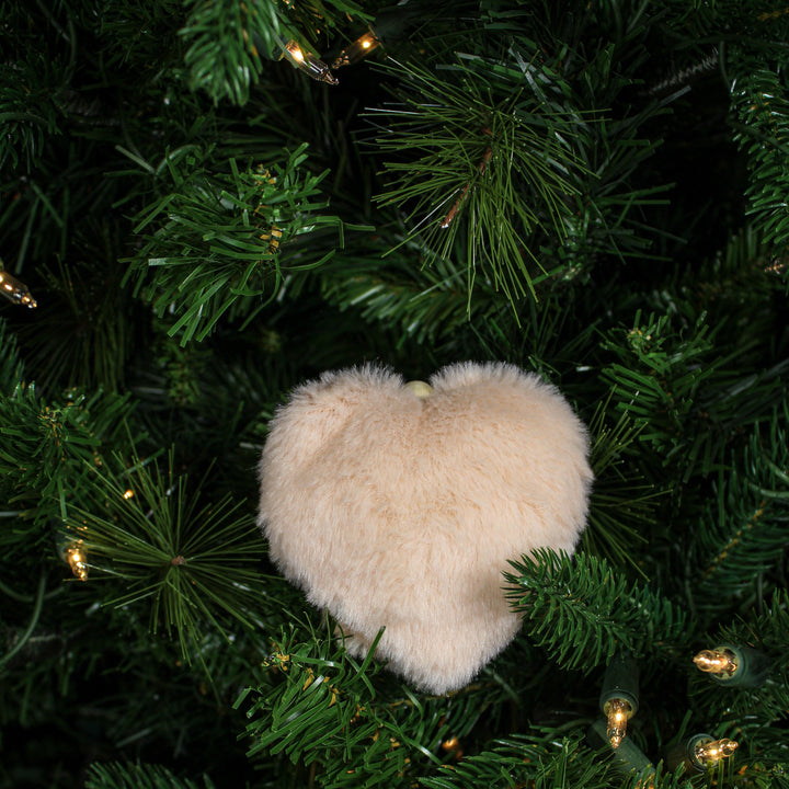 Cet ornement en forme de cœur de 4'' est recouvert d’un tissu doux à fausse fourrure, avec une finition raffinée. Il évoque la chaleur d’un cocon hivernal et s’harmonise avec une décoration nordique, romantique ou épurée.