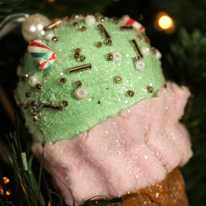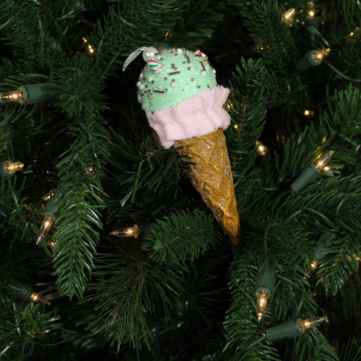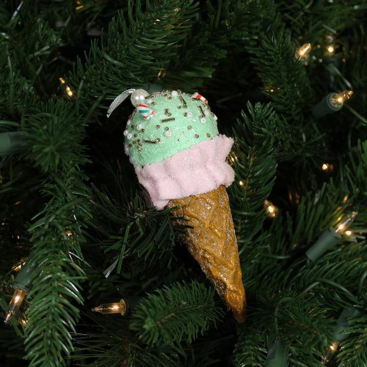 Ce cornet crème glacée vert de 5,5'' est un ornement parfait pour une décoration de Noël ludique et sucrée. Sa finition brillante et ses détails gourmands en font une pièce unique dans un sapin à thème.