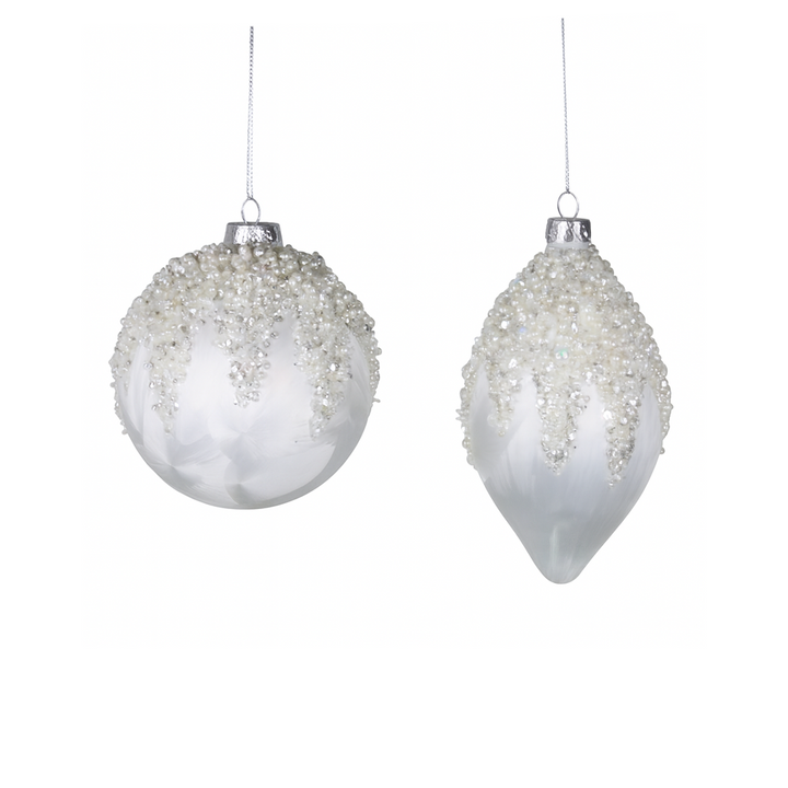 Cette boule ornementale pendante en verre irisé blanc 4" apporte une touche d’originalité avec sa forme élégante et élancée. Son fini irisé reflète la lumière en créant des reflets changeants, presque magiques. Elle s’intègre à merveille dans un thème givré, argenté ou nacré. Un ornement raffiné qui attire le regard et enrichit la composition globale.