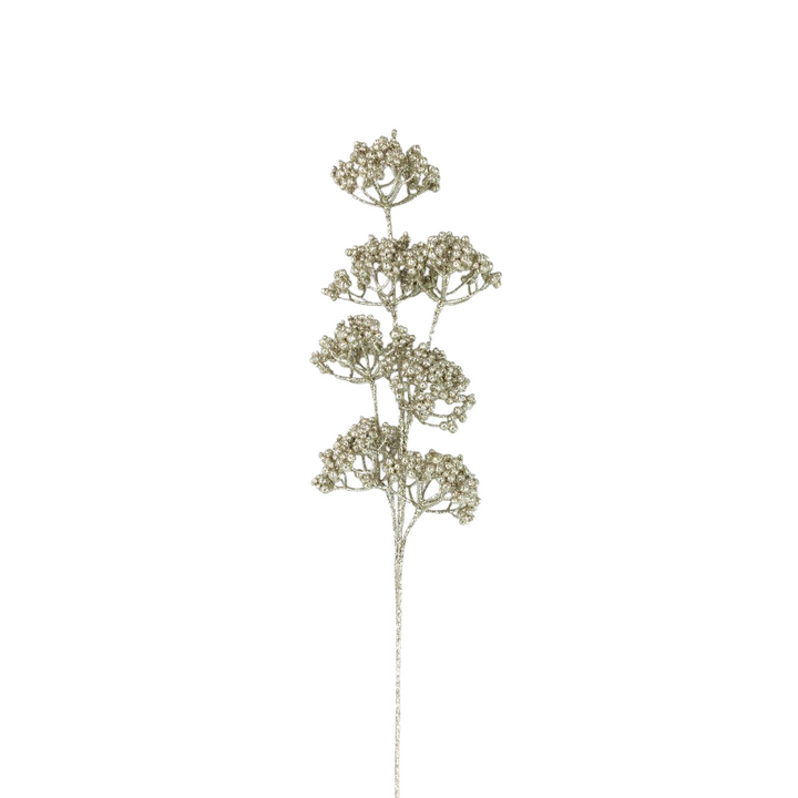 Cette tige baies en dentelle pailletée platine 27" combine élégance et brillance. Les baies ajourées sont ornées de paillettes fines pour un effet raffiné. Idéale pour apporter sophistication à vos compositions. Un élément chic pour un décor lumineux.