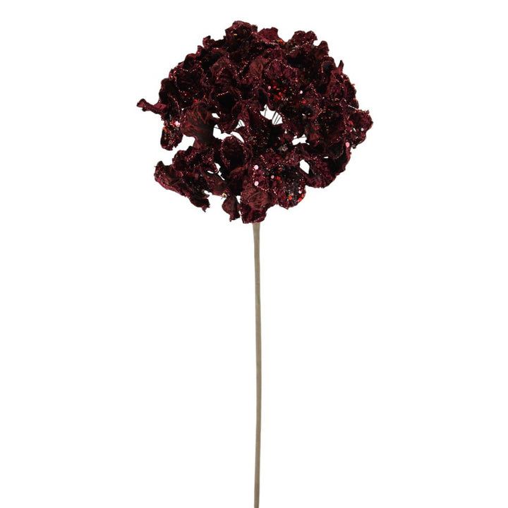 Cette tige d’hortensia pailletée merlot 20" apporte volume et texture grâce à ses multiples fleurs ornées de fines paillettes. Sa couleur intense enrichit visuellement les compositions. Elle se marie aussi bien avec des feuillages que des éléments métallisés. Parfaite pour compléter un décor chaleureux et élégant.