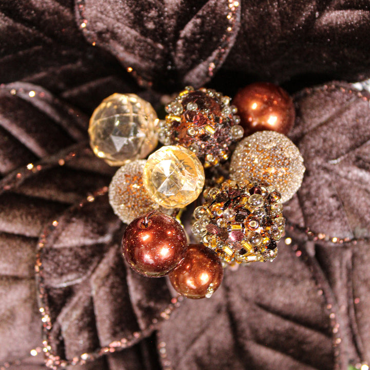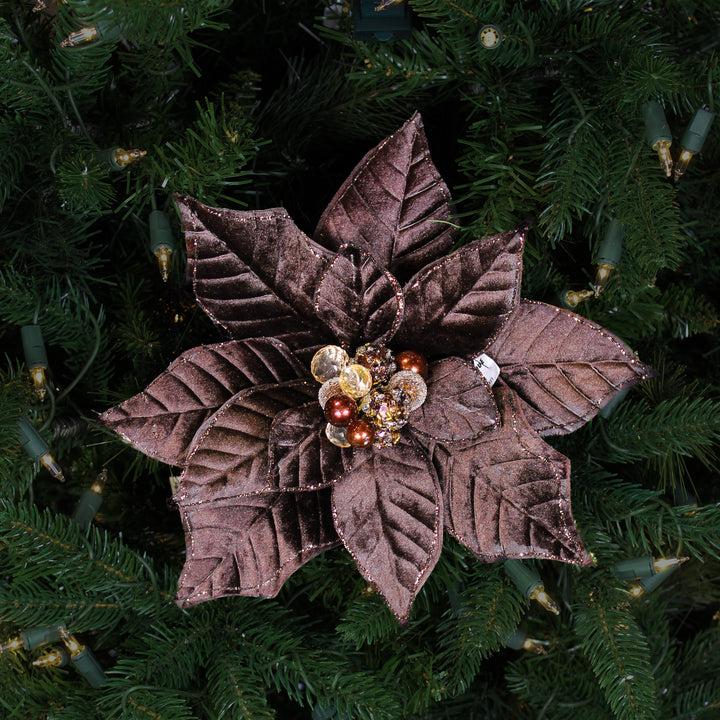 Cette tige de poinsettia en velours pailleté chocolat 18" séduit par sa teinte profonde et ses reflets lumineux. Le velours lisse et les paillettes créent un mariage harmonieux entre texture et éclat. Elle s’intègre facilement à un décor traditionnel ou moderne. Un choix parfait pour apporter profondeur et élégance.