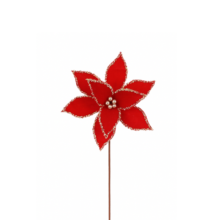 Cette tige de poinsettia velours/sequin rouge 20" attire le regard par son rouge vif et ses sequins scintillants. Le mélange de textures crée un contraste visuel captivant. Elle s’intègre parfaitement à un sapin traditionnel ou une composition luxueuse. Parfaite pour un style festif et éclatant.