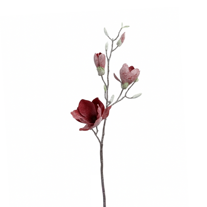 Cette tige magnolia givré rouge 32" se distingue par ses grandes fleurs et son effet givré réaliste. Les pétales rouges apportent intensité et chaleur. Elle s’intègre facilement dans de grands arrangements. Idéale pour un décor élégant et imposant.