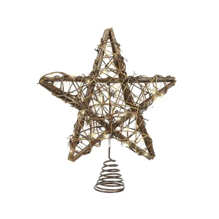 Cette cime étoile en rotin brun avec DEL combine tradition et raffinement grâce à sa teinte foncée et ses lumières intégrées. Le rotin ajoute de la texture tandis que la lumière douce illumine le sommet du sapin avec charme. Idéale pour une ambiance chaleureuse et artisanale. Elle s’intègre parfaitement à une décoration aux tons boisés et dorés.