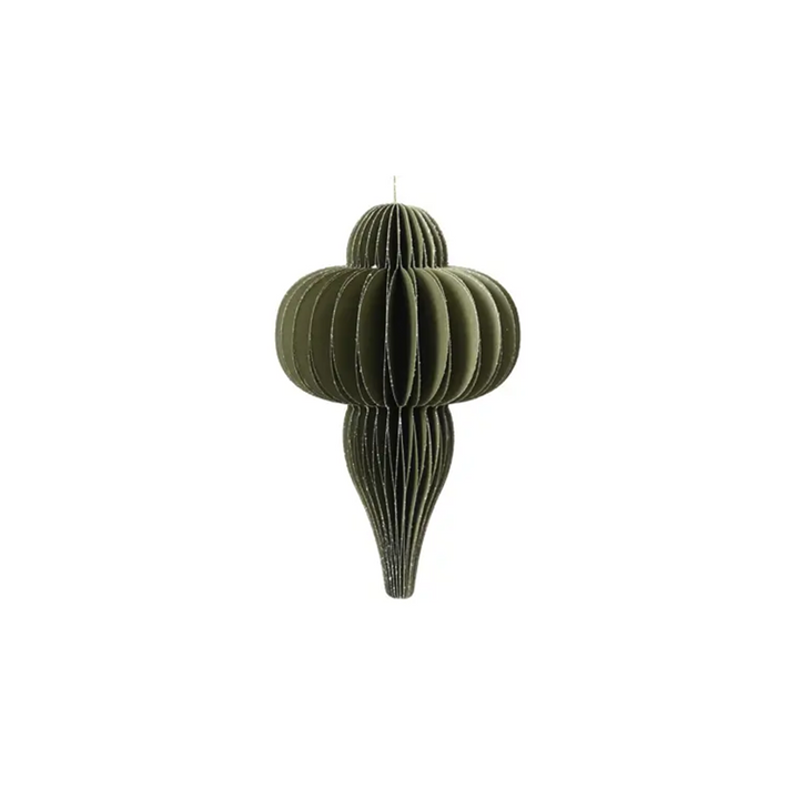Cet ornement en papier alvéolé vert 3.5" insuffle une touche naturelle à votre décoration de Noël. Sa petite taille le rend idéal pour compléter les espaces entre les branches. Le papier texturé capte la lumière et ajoute du relief au sapin. Une pièce discrète mais pleine de charme.