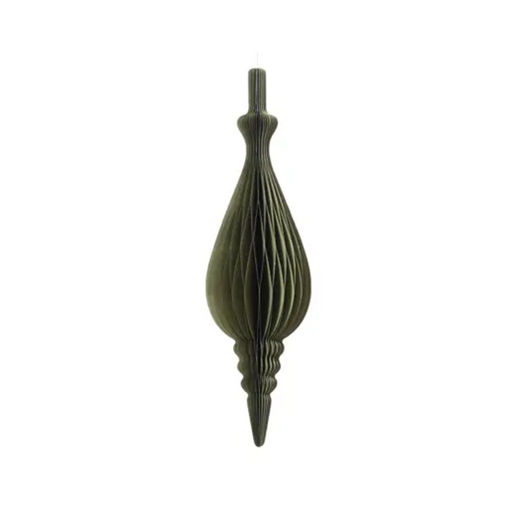 Cet ornement goutte en papier vert 8.5" associe originalité et naturel dans une silhouette élégante. Son papier texturé et sa teinte végétale en font un élément décoratif unique. Il s’intègre parfaitement à un sapin aux tons boisés ou dorés. Parfait pour casser la monotonie des formes classiques.