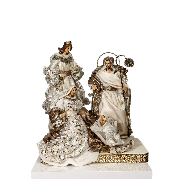 Sainte Famille en tissu, résine et métal avec ange 13"