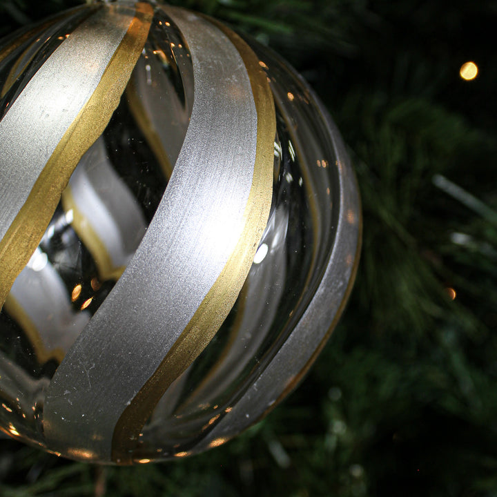 Boule en verre avec tourbillon de paillettes argent transparent 4" pour un effet givré et scintillant. Les paillettes argentées semblent flotter dans le verre, créant un look glacé élégant. Parfaite pour un thème hivernal ou monochrome. Elle reflète magnifiquement la lumière blanche des guirlandes.