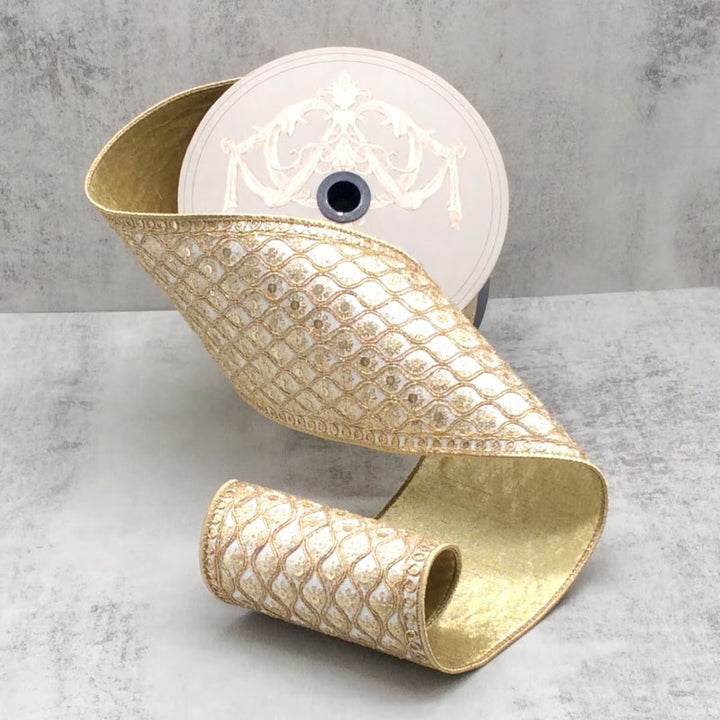 Ruban soie bourges sequins or blanc hivernal 11,5 cm x 9 m