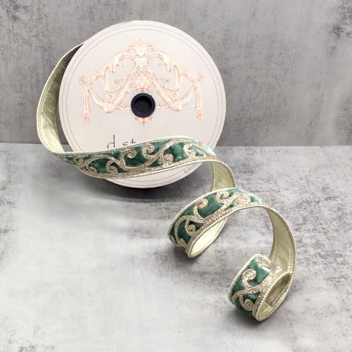 Ruban velours volutes pailletées platine bleu maussade 2,5 cm x 9 m